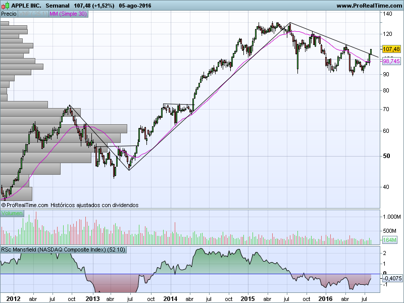 Por ejemplo, para Apple, nuestra candidata preferida a protagonizar cíclicas escaladas de precios por factores como: venta de productos y servicios reales, consumibots orientados, innovación tecnológica, etc., hemos diseñado la siguiente estrategia: