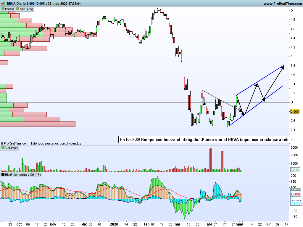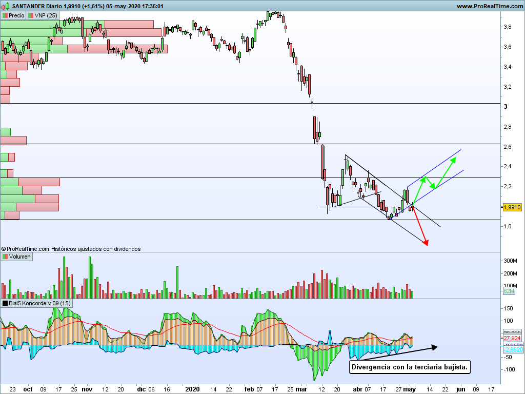 Las flechitas negras que veis en el canal azul (nueva terciaria alcista ¿en marcha?) son los movimientos del precio previsibles dentro del volumen de cotización.
