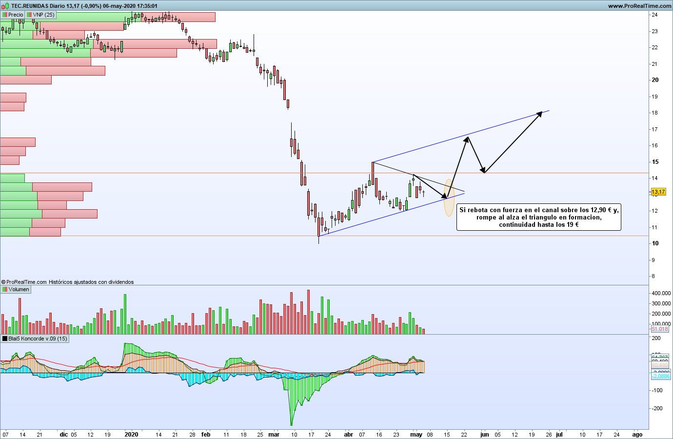 Tras frenarse la caída desde los 20 € hasta los 10 €, pérdida del 50 %, Técnicas reunidas ha dibujado dos mínimos ascendentes, y, dos máximos decrecientes para estar formando actualmente un triángulo simétrico. El indicador Konkorde hace una lectura de que, tanto manos fuertes como débiles están negociando la acción (la montañita marrón es alcista, cotiza por encima de la línea roja, etc.)