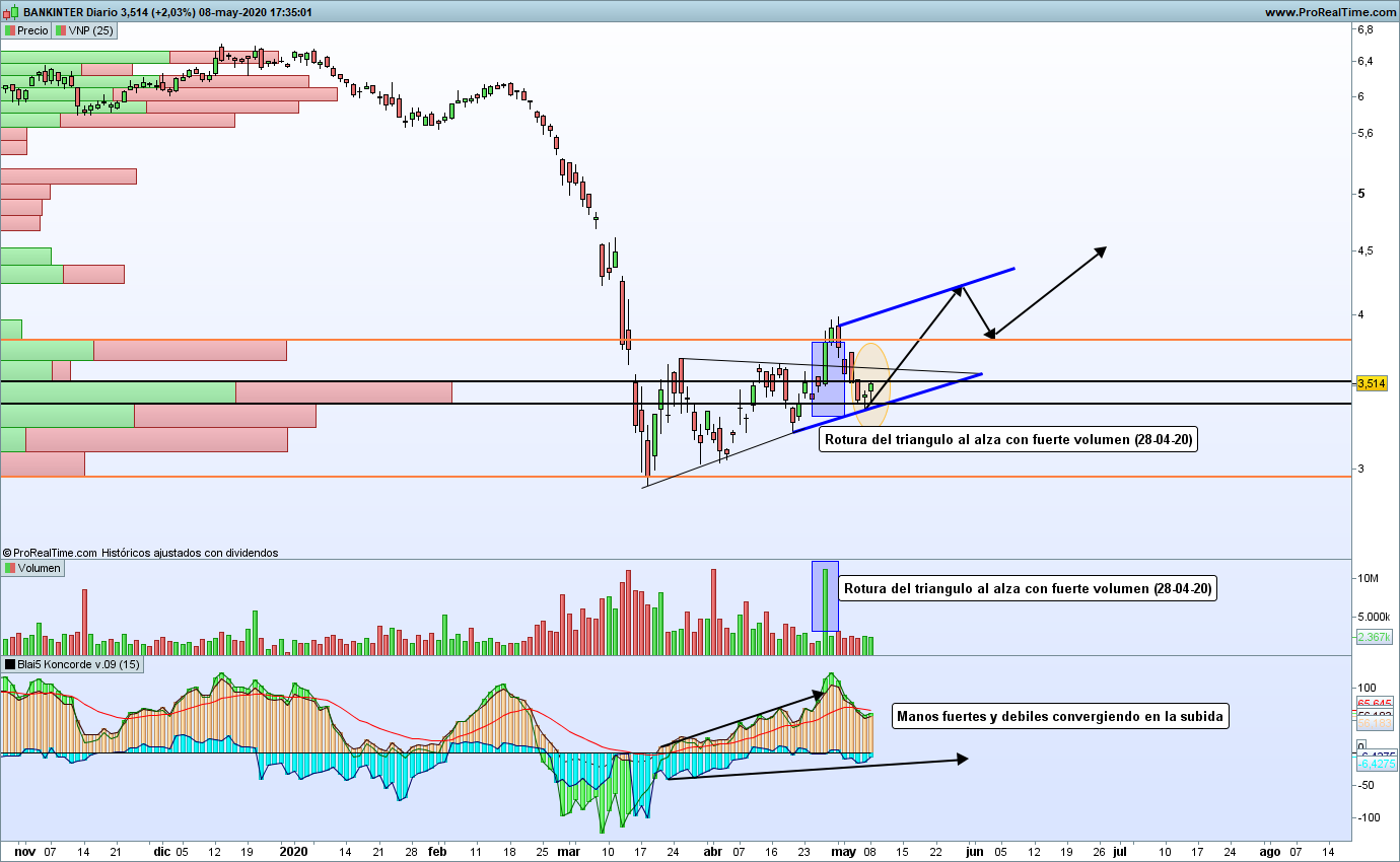 Creemos que, al seguir rebotando hacia arriba el precio dentro de la base del triángulo, Bankinter romperá muy pronto al alza cuando supere el precio de 3,60 € (techo del triángulo). En definitiva, técnicamente está iniciándose la gran tercera onda de una nueva súper tendencia terciaria alcista donde, la mayoría del volumen converge en los mínimos ascendentes de la base del triángulo..