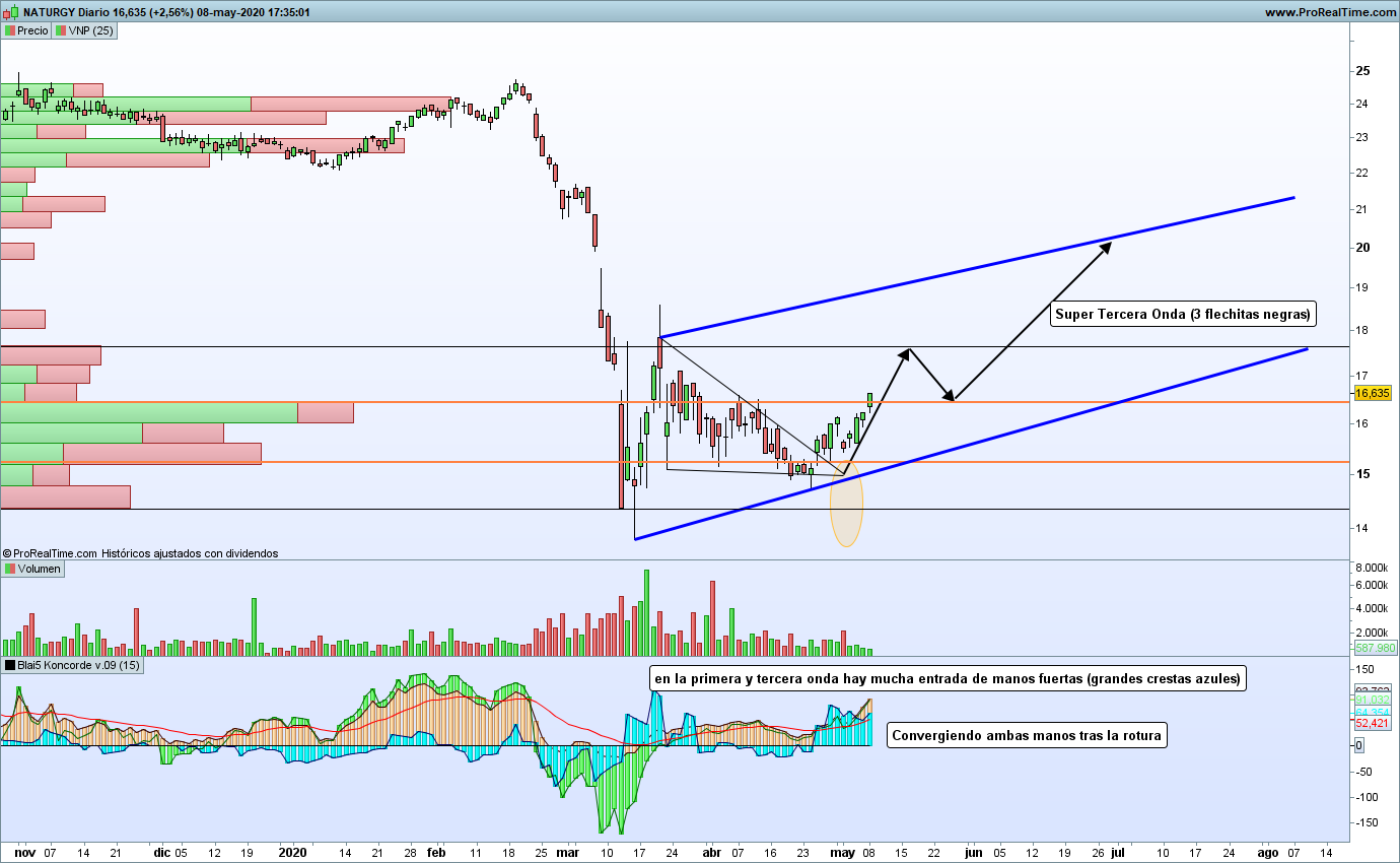 Naturgy (ídem): Previsión de inicio de una Súper Tendencia Secundaria Alcista (canal azulito) tras la formación de un gran triángulo. La tercera onda, será al mismo tiempo una súper tendencia terciaria alcista (flechitas negritas)