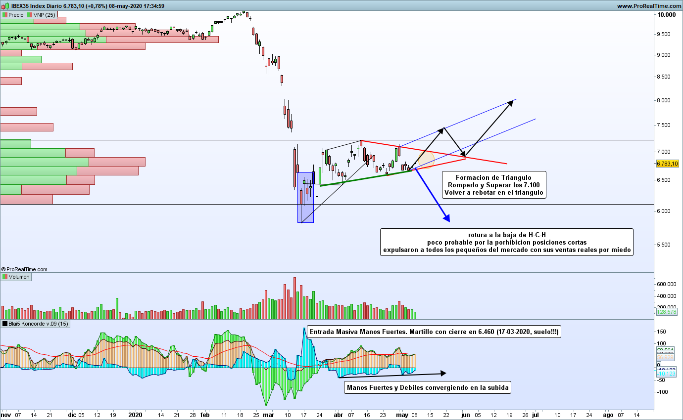 Si nos ponemos las gafas de cerca para el bajista, también podríamos estar viendo otra figura figura clásica del análisis técnico, Hombro-Cabeza-Hombro donde, la linea verde que hemos dibujado es el cuello de la misma. La flechita azul hacia abajo sería la dirección de la caida que, por el momento parece poco probable por las anteriores razones técnicas y que están prohibidas las ventas en corto, salvo que le den más cuerda a la nueva estafa global.