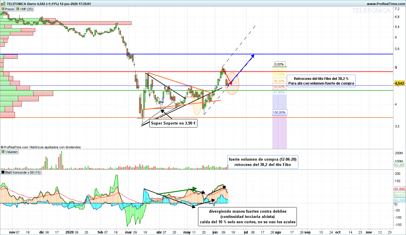 Como el análisis técnico es el único método que conocemos alternativo a la suerte para predecir movimientos de precio hasta que, la suerte sea un producto cotizado que se pueda comprar y vender, el pasado Viernes día 12 de Junio parece ser que la corrección de telefónica se ha detenido técnicamente impecable en el 38,2% de retroceso del Tito Fibo que, además coincide con los dos anteriores máximos situados en el nivel de 4,50 € y, cerrando con volumen fuerte de compra.
