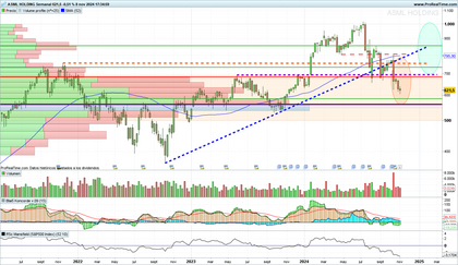 Causalmente, la barra morada se encuentra justo por encima del anterior doble suelo y, aunque actualmente la cotización no se encuentra en tendencia primeria alcista, tal y como demuestra la cotización que se encuentra por debajo de la línea azul discontinua, recordad que, venimos del futuro, donde ASML HOLDINGS aún sigue siendo una de las compañías más importantes del mundo sin competencia ya que, China aún está haciendo solo la titánica inversión necesaria para fabricar en un futuro estas máquinas de litografía y, no depender solo de esta compañía. Así que esta compañía aún tiene 5-10 años de solitario recorrido.