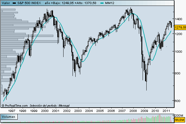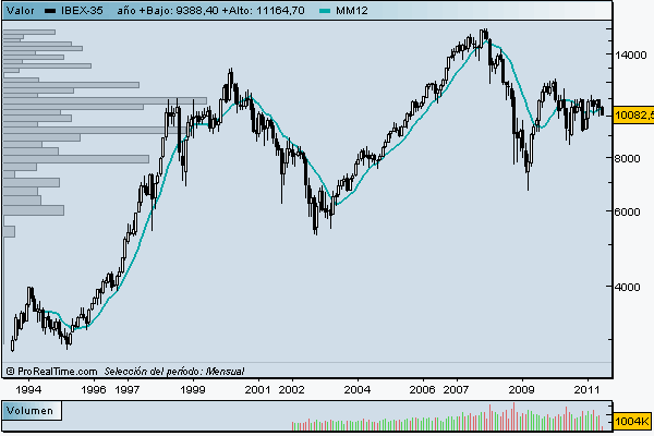 El volumen por cotización os dará además excelentes pistas, concretamente, sobre que zonas hay mas o menos movimiento, y por tanto nos indicará que niveles son relevantes; Techos, Suelos, figuras técnicas, etc. Cuando los gráficos son mensuales, los techos y suelos son los protagonistas, gráficamente siempre salta a la vista.