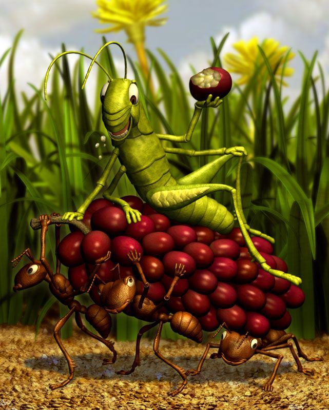 Una cigarra pensaba que la hormiga era tonta, y se paso el verano sin ayudar a la hormiga haciendo turismo, bailando, cantando y de juerga todo el día sin preocuparse por su futuro.
