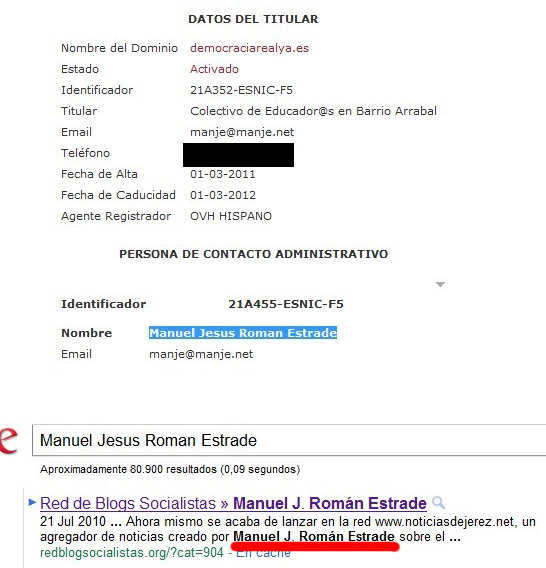 No les hablaré de Democracia Real YA ni de la acampada en la Puerta del Sol que se está extendiendo como la pólvora por toda la geografía nacional, para eso están los medios. Pero sí que he descubierto algo preocupante en Twitter gracias uno de sus usuarios, @kurioso. Ya ayer me dejó un poco mosqueado el hecho de que el PSOE colgase en su página web el manifiesto de Democracia Real YA, que por cierto quitaron al poco tiempo (y posiblemente un becario fue despedido), pero más me mosqueo ahora al comprobar que detrás del dominio www.democraciarealya.es se encuentra Manuel J. Román Estrade, un tipo vinculado al PSOE.