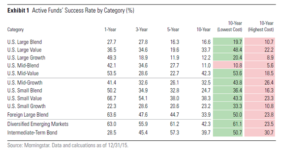 En la segunda tabla se puede ver con claridad como la tasa de éxito de la gestión activa cae progresivamente a mayor plazo temporal, haciéndonos ver lo difícil que es batir al mercado a largo plazo.