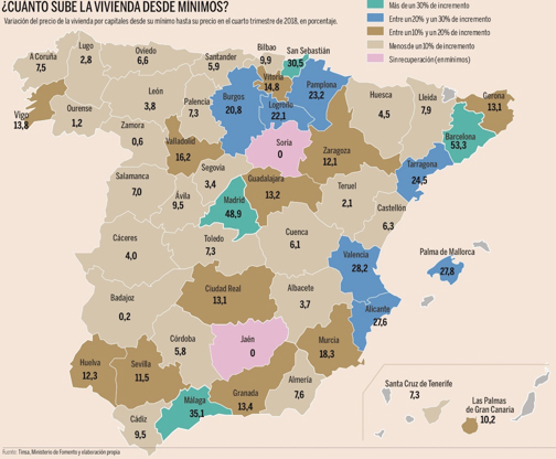 El precio de la vivienda ha vuelto a subir desde mínimos en el 2018 prácticamente en toda España, situándose la media en un 6% en el ultimo cuatrimestre del año y colocándose Barcelona y Madrid a la cabeza de la lista con aumentos del 53% y 49% respectivamente. Como veremos después el incremento en las grandes capitales se ha visto favorecido debido al continuo aumento de los alquileres por el cual muchos inquilinos han aprovechado los bajos intereses para pedir una hipoteca.