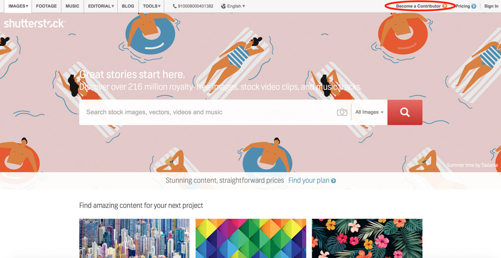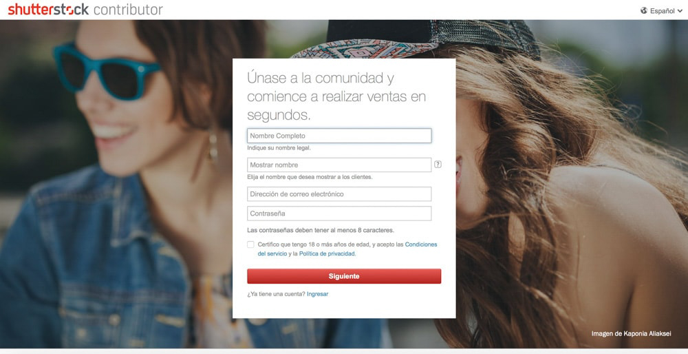 - A continuación, se nos abrirá la pantalla de registro de los colaboradores de Shutterstock y debemos registrarnos en la parte superior derecha