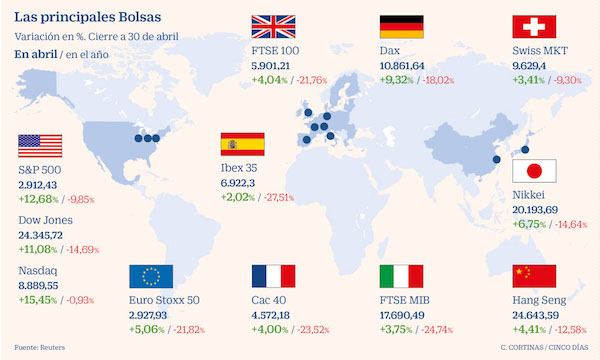 En el siguiente gráfico podemos ver el impacto del coronavirus durante el mes de abril en los principales mercados mundiales y la caída global en lo que llevamos de año.