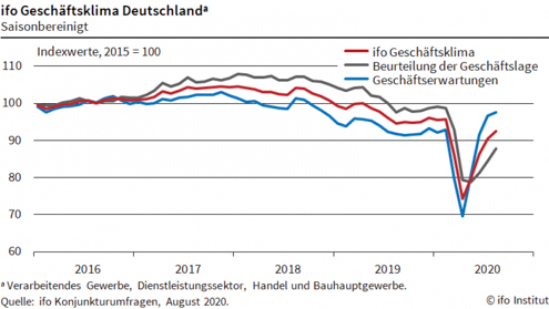 El IFO de agosto se ha situado en 92,6, ligeramente superior a la del mes pasado, estando por debajo de 100, lo cual augura una tendencia negativa. No obstante, la tendencia desde marzo es positiva, lo que permite ser optimista de cara a los futuros meses.