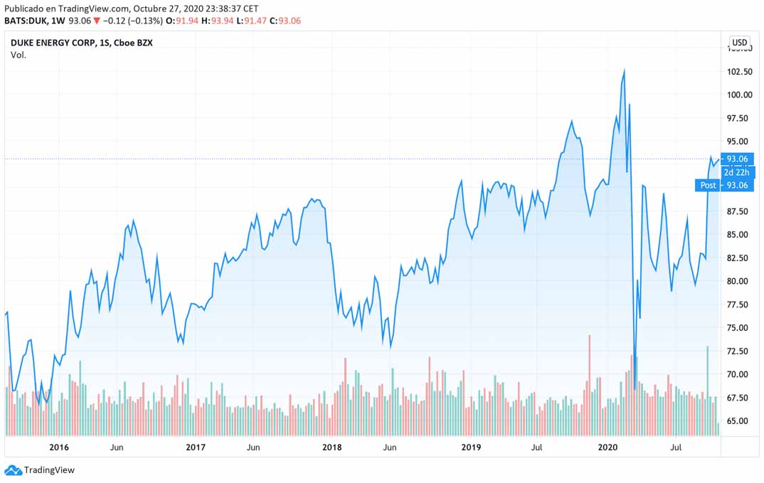 A día de hoy, las acciones de Duke Energy cotizan a 93 US$, mientras que hace cinco años cotizaban a 75 dólares. En este período ha repartido 17,77 dólares en dividendos; actualmente, los dividendos son de 3,86 US$ al año, lo que representa una rentabilidad del 3,86%.