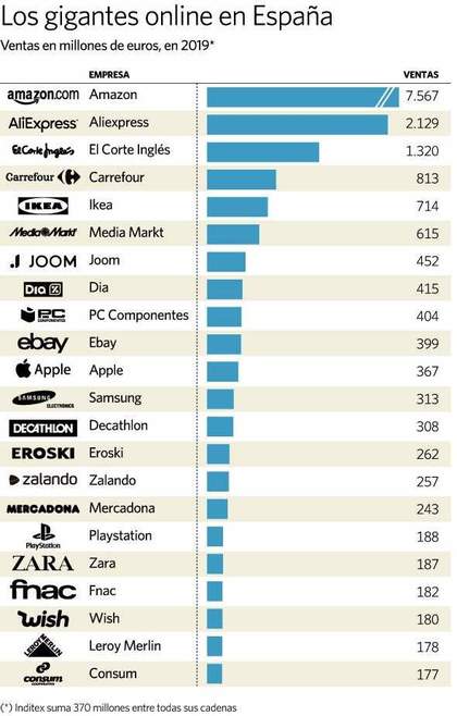 Amazon se ha consolidado como el líder indiscutible del comercio electrónico en España, masacrando a todos sus rivales y facturando más que sus diez inmediatos competidores juntos. La plataforma estadounidense lidera el mercado, seguido por la china Aliexpress, tanto en facturación como en número de pedidos y visitas. La empresa de Jeff Bezos logró en el año 2019 facturar en España de 7.567 millones de euros, lo que supone un 70% más que el año anterior además de triplicar las ventas logradas por Aliexpress, segundo en la lista con unos ingresos de 2.129 millones. Amazon alcanza así el 15,7% del total del mercado y Aliexpress el 4,4%.