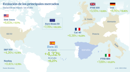 El mes de marzo ha vuelto a vestir de verde las bolsas mundiales y ha sido especialmente positivo en las bolsas europeas, con subidas cercanas al 9% en el DAX alemán, al 8% en la bolsa de Milán y 6% en la bolsa de Paris. El Ibex, que suele ser el patito feo, ha cerrado marzo con una subida del 4,3%.