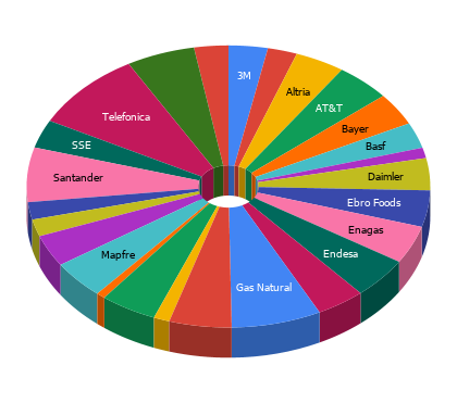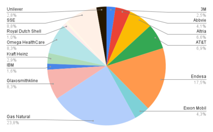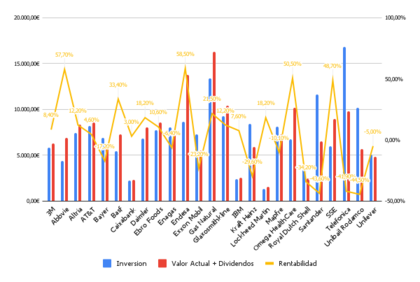 El gráfico de mejores y peores de la cartera prácticamente no sufre cambios, actualmente 11 de los 26 valores que llevamos están en positivo. Los que mejor se están comportando a cierre de mes son: Abbvie (51.0%), SSE (38.9%) y Omega Healthcare (29.3%), mientras que en la parte baja de la tabla están los rezagados de los últimos meses, tenemos a los clásicos del Ibex, Telefónica (-65.5%) y Santander (53.6%) y Unibail Rodamco (-49.7%).