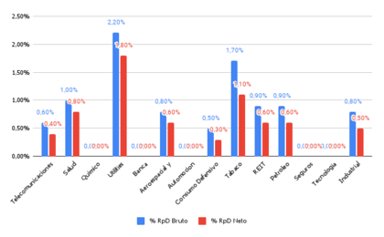 En relación con lo comentado en el anterior gráfico los sectores del Tabaco, las Utilities,Salud y REIT aportan una parte importante de la rentabilidad de nuestra cartera (3,5% en el peor de los casos y 5,4% en el mejor).