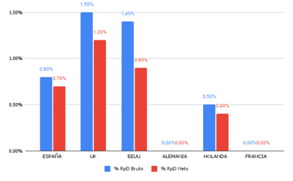 En este último gráfico podemos ver claramente la doble retención de los mercados que componen nuestra cartera, reduciendo de manera importante las plusvalías. Aún no hemos percibido ingresos de los mercados con más penalización (Francia y Alemania).