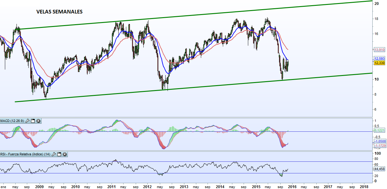 A corto plazo, el valor a tener en cuenta son los 12,8€. Es decir, cuando realmente se confirme una rotura de la resistencia y por tanto podamos tener como objetivo el ancho del canal, objetivo que se cumple para los 14€. Esto supone una rentabilidad de más de un 9% con la posibilidad de colocar nuestro stop loss por debajo de los 12,8€ en la mitad del canal. Una operación en la que podríamos fácilmente conseguir un ratio ganancia/pérdida de 2.