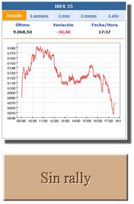 Sesión aburrida y sin volumen la vivida hoy por nuestros mercados. El Ibex 35 cierra en 9.068,50 puntos, tras ceder un 0,33%, habiendo oscilado entre un máximo de 9.186,80 y un mínimo de 9.040,80 puntos. El volumen de negociación ha sido tan sólo de ¡1.493 millones!.
