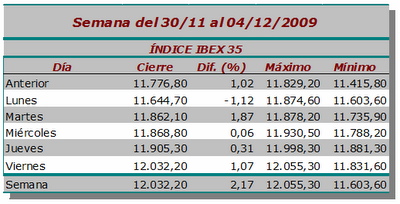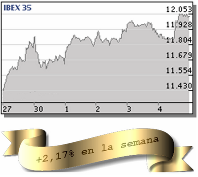 El Ibex-35 sube un 2,17% en la semana, cerrando en 12.032,20 puntos, a escasos 2,2 puntos de su máximo anual. El mayor máximo intradía, ha sido 12.055,30 puntos (viernes) y el menor mínimo, 11.603,60 puntos (lunes), en una nueva semana con escaso volumen de negociación de los inversores, apenas 12.911 millones de euros en todo el mercado.