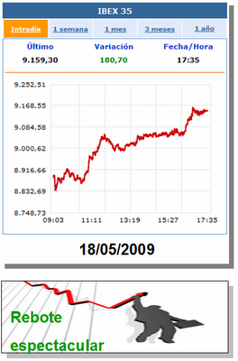 Tras encadenar cinco jornadas consecutivas de pérdidas, el Ibex-35, animado por bancos y constructoras, ha protagonizado hoy un rebote espectacular, subiendo un 2,01% y cerrando practicamente el máximos, en 9.159,30 puntos. El mínimo intradía ha sido de 8.828,50 puntos y el máximo 9.163,20 puntos, en una sesión en la que el volumen negociado por los inversores se ha situado en los 3.358 millones de euros en todo el parqué.