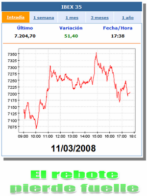 El Ibex 35 consigue, a duras penas, cerrar la sesión con un nuevo repunte del 0,72%, cerrando en 7.204,70 puntos. El mínimo intradía ha sido de 7.063,30 puntos y el máximo 7.357,10 puntos. El volumen negociado por los inversores ha ascendido a 2.552 millones de euros en todo el mercado continuo. El sector bancario ha sido hoy, de nuevo, el que más ha rebotado, Sabadell ganó un 3,98%, BBVA un 3,12%, Santander un 2,89% y Popular un 1,90%.
