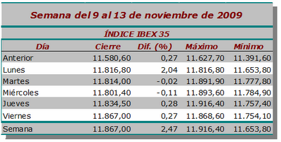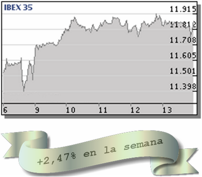 Remontada del Ibex-35, que avanza un 2,47% en la semana, hasta los 11.867,00 puntos, a tan sólo un 0,20% de su máximo anual (11.891,20 puntos). El menor mínimo intradía ha sido 11.653,80 puntos (lunes) y el mayor máximo 11.916,40 puntos (jueves), mientras que los inversores han negociado, durante el periodo, un total de 19.492 millones de euros en todo el mercado.