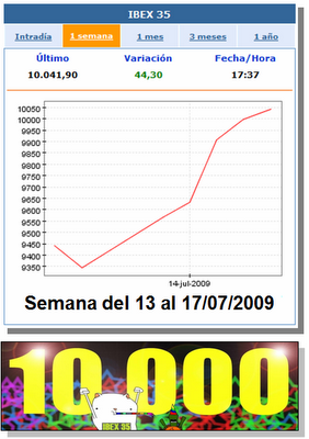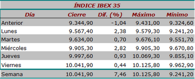 Contrariamente a todo pronóstico, mientras casi todo el mundo, el inversor sosegado incluido, auguraba un agravamiento de la corrección, el Ibex-35 ha protagonizado una semana alcista triunfal, no vista desde noviembre del pasado año. Concretamente ha subido un +7,46% semanal, cerrando por encima de la cota psicológica de los 10.000 enteros, en 10.041,90 puntos, nuevo máximo anual. El menor mínimo intradía de la semana ha sido 9.241,20 puntos (martes) y el mayor máximo 10.125,80 puntos (viernes). El volumen de contratación durante el periodo ha ascendido a 20.233 millones de euros en todo el mercado.