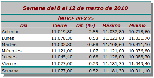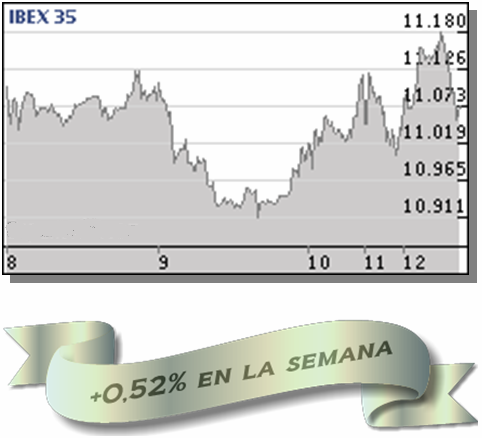 El Ibex-35 cierra una nueva semana alcista, con una subida del 0,52% hasta los 11.077,00 puntos, un 9,37% por debajo de su máximo anual (12.222,50 puntos). El menor mínimo intradía ha sido 10.911,10 puntos (martes) y el mayor máximo, 11.181,30 puntos (viernes), mientras que los inversores han movido en total apenas 11.723 millones de euros en todo el mercado.