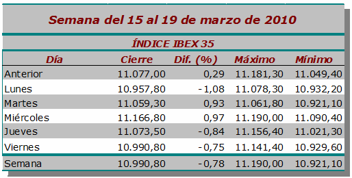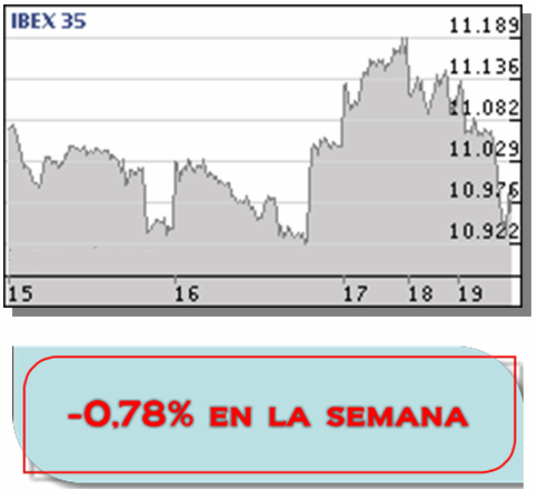 Balance semanal negativo para el Ibex-35, que pierde un 0,78% y cierra en 10.990,80 puntos, un 10,08% por debajo de su máximo anual. El menor mínimo intradía ha sido 10.921,10 puntos (martes) y el mayor máximo, 11.190 puntos (miércoles), mientras que el volumen de contratación durante el periodo se ha situado en 16.555 millones de euros en todo el mercado.