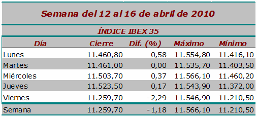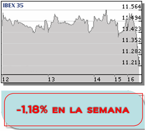 Balance semanal negativo para el Ibex-35, que corrije un 1,18% hasta los 11.259,70 puntos, un 7,88% por debajo de su máximo anual. El menor mínimo intradía ha sido 11.210,50 puntos (viernes) y el mayor máximo, 11.566,10 puntos (miércoles), mientras que los inversores han movido, durante el periodo, un total de 22.174 millones de euros en todo el mercado.