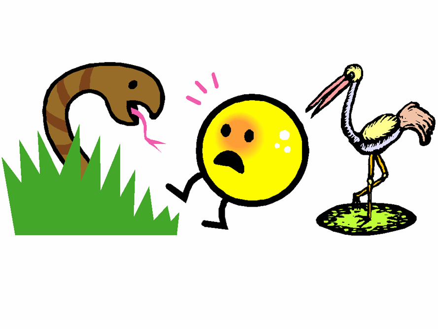 Camino a su casa, el hombre vio una garza, se le acercó y le contó en voz baja lo sucedido. La garza le dijo que volviera a ponerse en cuclillas e hiciera fuerza para expulsar a la serpiente. Cuando la víbora asomó la cabeza, la garza la sujetó con fuerza, la extrajo de su refugio y la mató.