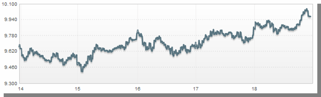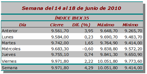Semana positiva para el Ibex-35 que sube un 4,29%, cerrando en 9.971,80 puntos, un 18,41% por debajo de su máximo anual. El menor mínimo intradía ha sido 9.414 puntos (martes) y el mayor máximo, 10.051,80 puntos (viernes), mientras que el volumen de contratación de los inversores, durante el periodo, se ha situado en 22.315 millones de euros en todo el mercado.