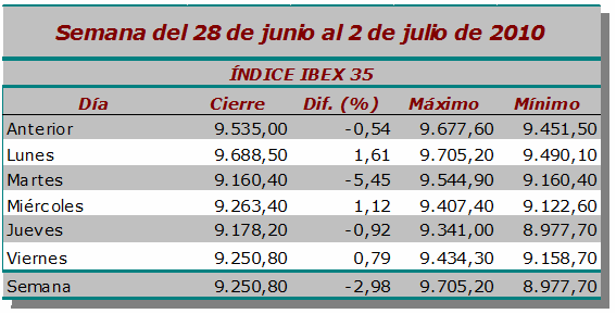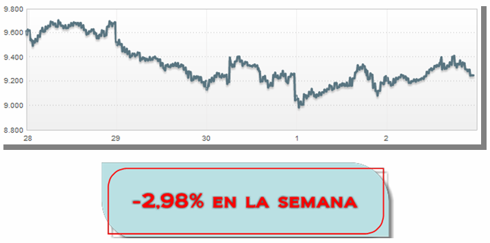 Nueva semana en negativo para el Ibex-35, que pierde un 2,98% hasta los 9.250 puntos, un 24,31% por debajo de su máximo anual. El menor mínimo intradía ha diso 8.977,70 (jueves) y el mayor máximo, 9705,20 (lunes), mientras que el volumen de contratación de los inversores, durante el periodo, se ha situado en 21.445 millones de euros en todo el mercado.