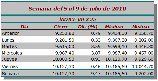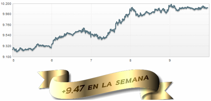 El Ibex-35 ha protagonizado esta semana un importantísimo rebote del 9,47% hasta los 10.127,30 puntos, un 17,14% por debajo de su máximo anual. El menor mínimo intradía ha sido 9.202 puntos (lunes) y el mayor máximo, 10.185,50 (viernes), mientras que el montante negociado por los inversores, durante el periodo, se ha situado en 19.464 millones de euros en todo el mercado.