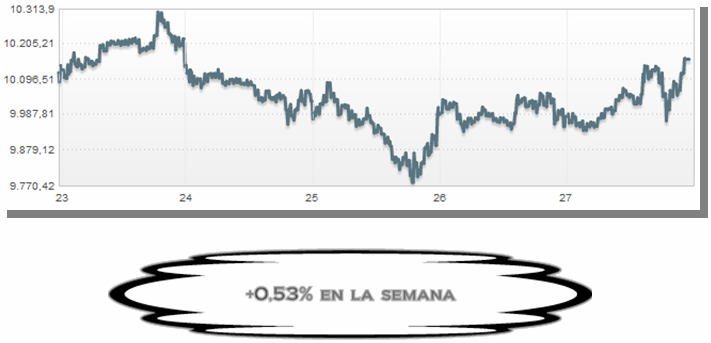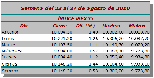 Tras haber llegado a perderla, el Ibex-35 consigue mantenerse sobre la cota psicológica de los 10.000 puntos, cerrando la semana en 10.148,20 puntos, un 16,97% por debajo del máximo anual. El menor mínimo intradía ha sido 9.773,80 puntos ( miércoles) y el mayor máximo, 10.306,20 (lunes); mientras que el volumen de contratación, siguiendo la tónica de todo este mes de agosto, ha vuelto a ser insignificante, apenas 8.509 millones de euros en todo el mercado.