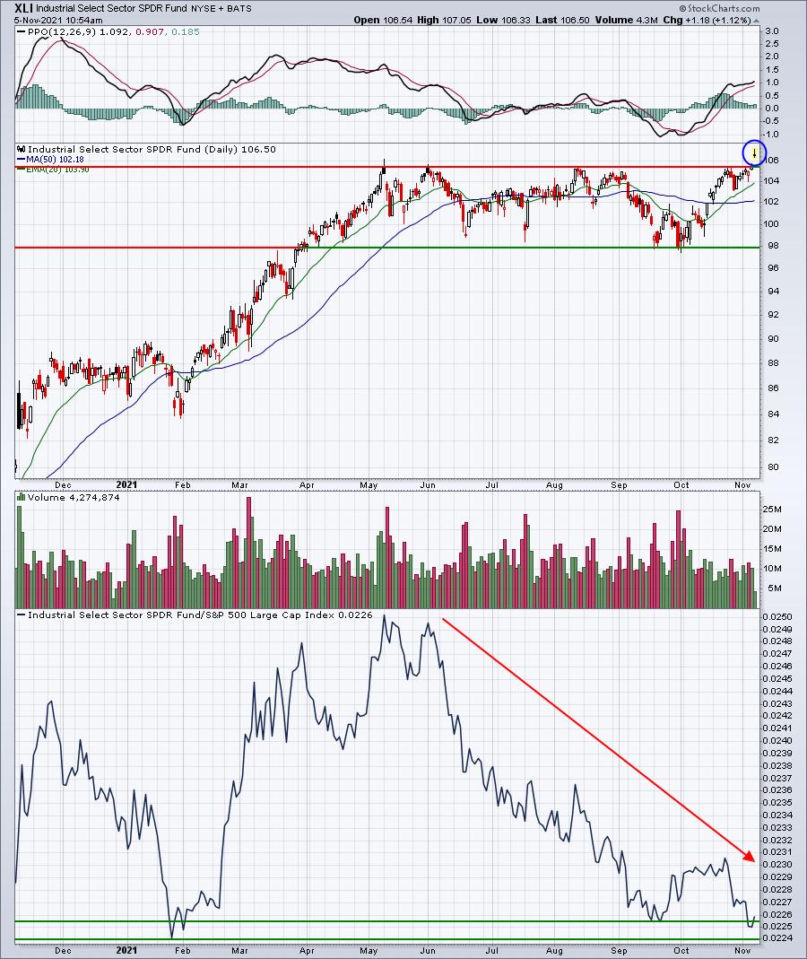 Vemos r la enorme fuerza relativa de los industriales (XLI). La razón por la que digo esto es que hoy estamos viendo una gran ruptura de precios en el XLI: