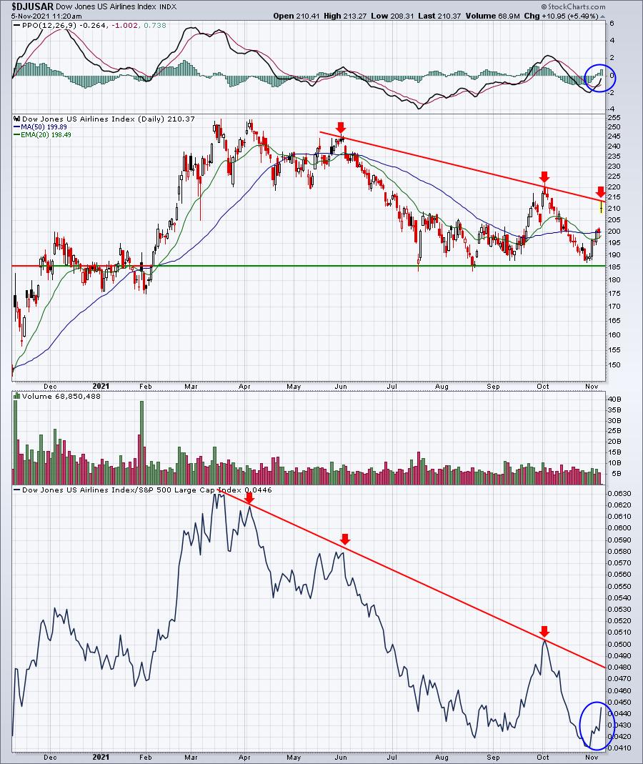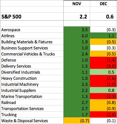 Si bien casi todos los grupos de la industria dentro de la industria AMAN el mes de noviembre, dos industrias realmente se destacan: aerolíneas ($ DJUSAR) y aeroespacial ($ DJUSAS):