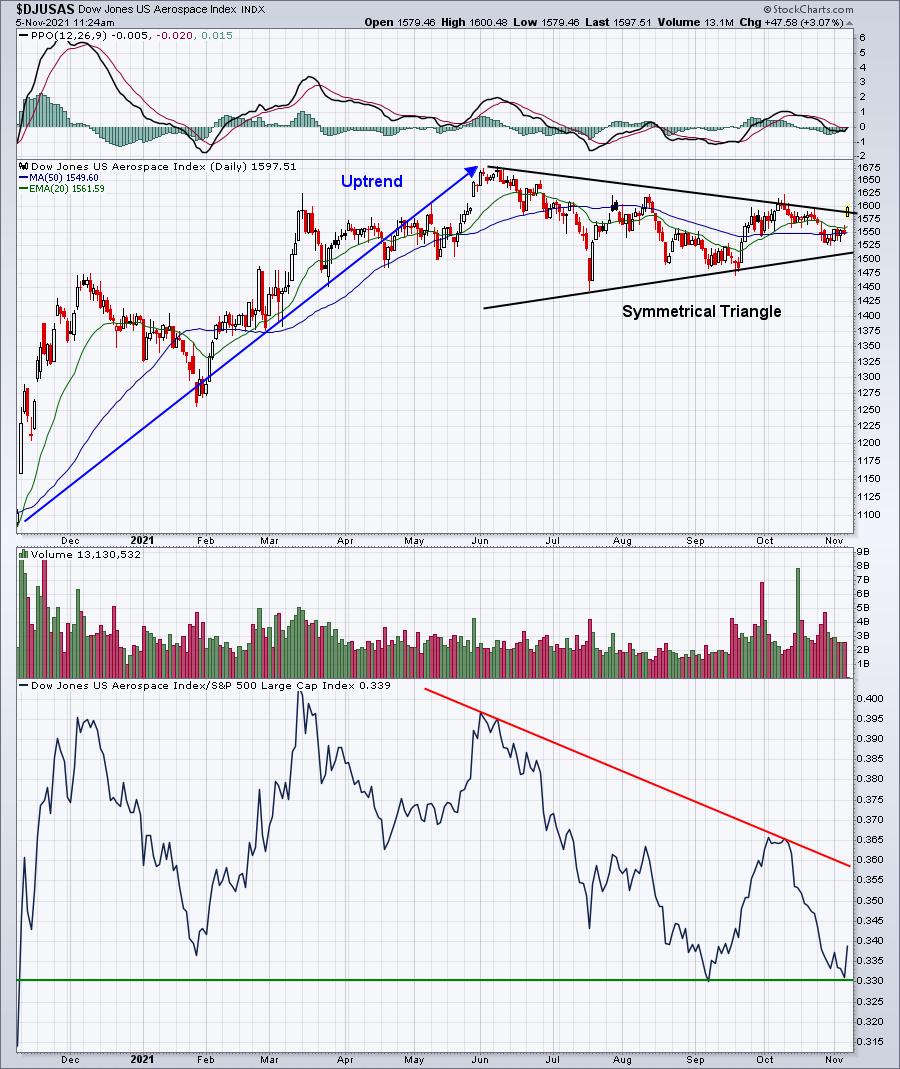 ¿Estamos viendo el inicio de una ruptura alcista del patrón de continuación del triángulo simétrico? Si es así, estaría buscando mucha más fuerza en la industria aeroespacial durante el resto de noviembre.