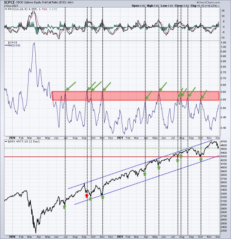 El área sombreada en rojo muestra que el promedio móvil de 5 días de este ratio en ese rango de .55-.60 es donde la mayoría de nuestros mínimos se han formado a lo largo de este avance del mercado alcista secular desde el mínimo de marzo de 2020. He destacado 10 de esas ocasiones desde julio de 2020 y diría que 9 de las 10 dieron señales muy precisas.