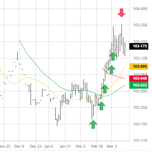 "Bonos del Tesoro a 2 años. El precio comenzó a subir a mediados de febrero, cuando los datos preliminares mostraron una desaceleración, lo que significa que los inversores comenzaban a esperar un recorte de la Fed como respuesta.