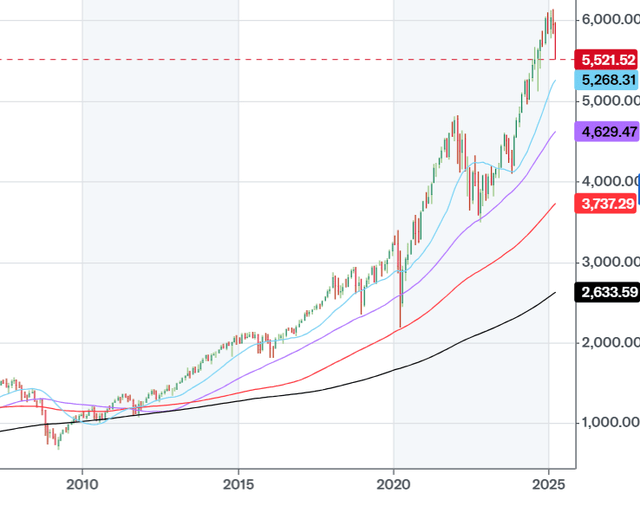 - Finalmente, debemos considerar que nos encontramos en una fase de colapso, y esto podría deberse a una salida de capital extranjero de los activos estadounidenses debido a las políticas de Trump. En este caso, ninguno de estos análisis es apropiado. La mejor métrica para esto es el dólar estadounidense ( DXY ): si el dólar sufre una fuerte caída, todo se pierde. Aquí hay un gráfico a largo plazo del S&P 500 ( SP500 ) ( SPY ) que muestra la violencia de la reciente caída, y si continúa, podríamos estar en una fase de colapso. Esa sería la razón para volver a vender en corto."