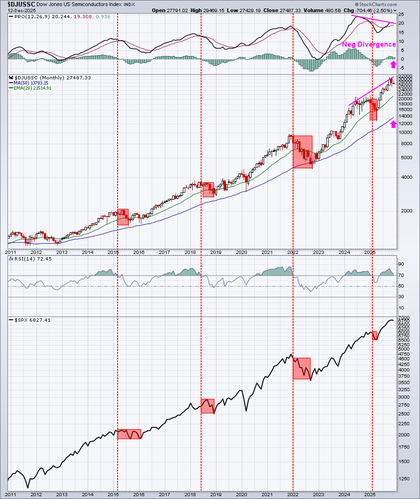 El oscilador de precios porcentual (PPO) mensual alcanzó máximos de impulso en 2024 que nunca antes habíamos visto. El repunte de 2025 nos ha dejado con una divergencia negativa a largo plazo que probablemente deberá resolverse en algún momento. Busco una prueba SMA de 50 períodos y/o una prueba de línea central PPO (flechas rosadas) para "restablecer" el impulso en el futuro después de ver surgir divergencias negativas.