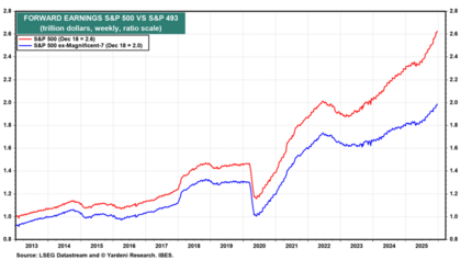 La pendiente ascendente de las ganancias futuras del Impressive-493 se acentuó significativamente en 2025 (gráfico). Las ganancias futuras de este compuesto aumentaron aproximadamente un 10% este año. Esto representa la mitad del aumento en las ganancias futuras del Magnificent-7, pero prevemos que la creciente competencia en el sector de la IA beneficiará al Impressive-493 y lastrará al Magnificent-7.