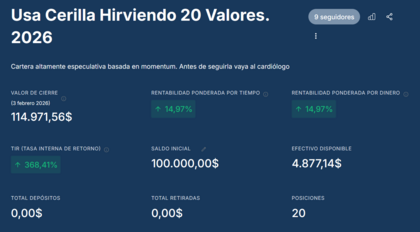 Cartera cerilla hirviendo 20 valores 2026. Cartera altamente especulativa basada en Momentum. Visitar al cardiólogo antes de visitarla. Alcanzamos a finales de mes el 20% pero tuvimos que devolver la mitad de la ganancia por la crisis de metales. Ahora en semiconductores y equipamiento eléctrico.