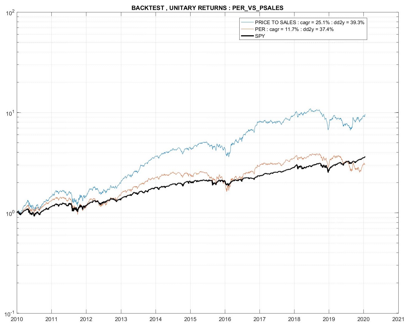 Podemos hacer muchos estudios estadísticos y análisis, pero vamos a hacer este ejercicio muy fácil de ver. Con la base de datos de empresas (todo NYSE y NASDAQ) que utilizamos en Invest and Trading vamos a hacer la siguiente simulación de inversión: desde el 1 de enero de 2010 vamos a invertir en las 100 mejores empresas por PER balanceando la cartera cada 30 días, y en paralelo vamos a invertir en las 100 mejores empresas por P/Sales en las mismas condiciones, hasta el día de hoy. Y lo que obtenemos es bastante esclarecedor, el mercado no premia prácticamente las inversiones basadas en PER, el comportamiento es muy parecido al promedio del mercado, pero sin embargo la inversión basada en el P/Sales tiene un beneficio muy superior, lo que da a indicar que estadísticamente es muy beneficioso tenerlo como un parámetro de estudio “value”.