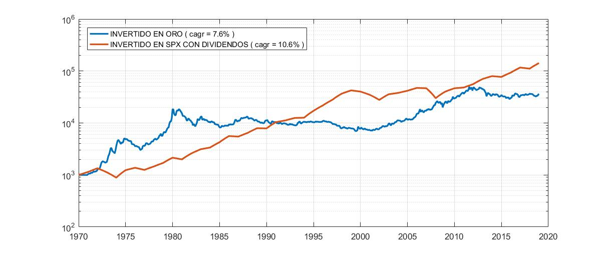 Para ver lo que ha significado el oro a lo largo del tiempo, podemos compararlo con el S&P500 desde 1970, momento en el que deja de tener vigencia el patrón oro. En la gráfica siguiente se ve la evolución de 1000$ invertidos el 1 de enero de 1970 en el S&P500 reinvirtiendo los dividendos frente a 1000$ invertidos en oro. Se ve que las dos gráficas están des-correlacionadas, cuando el S&P500 tienen fuerte tendencia alcista el oro se aplana, y viceversa. Por eso es bueno tener oro en cartera, porque nos protege frente a malas épocas. Una proporción del 50% quizás sea excesiva, pero un 25% en oro puede ser una buena idea; entre el 100% en físico para pequeños patrimonios, y una parte en físico por cada dos partes en oro-papel bien gestionado para grandes patrimonios.
