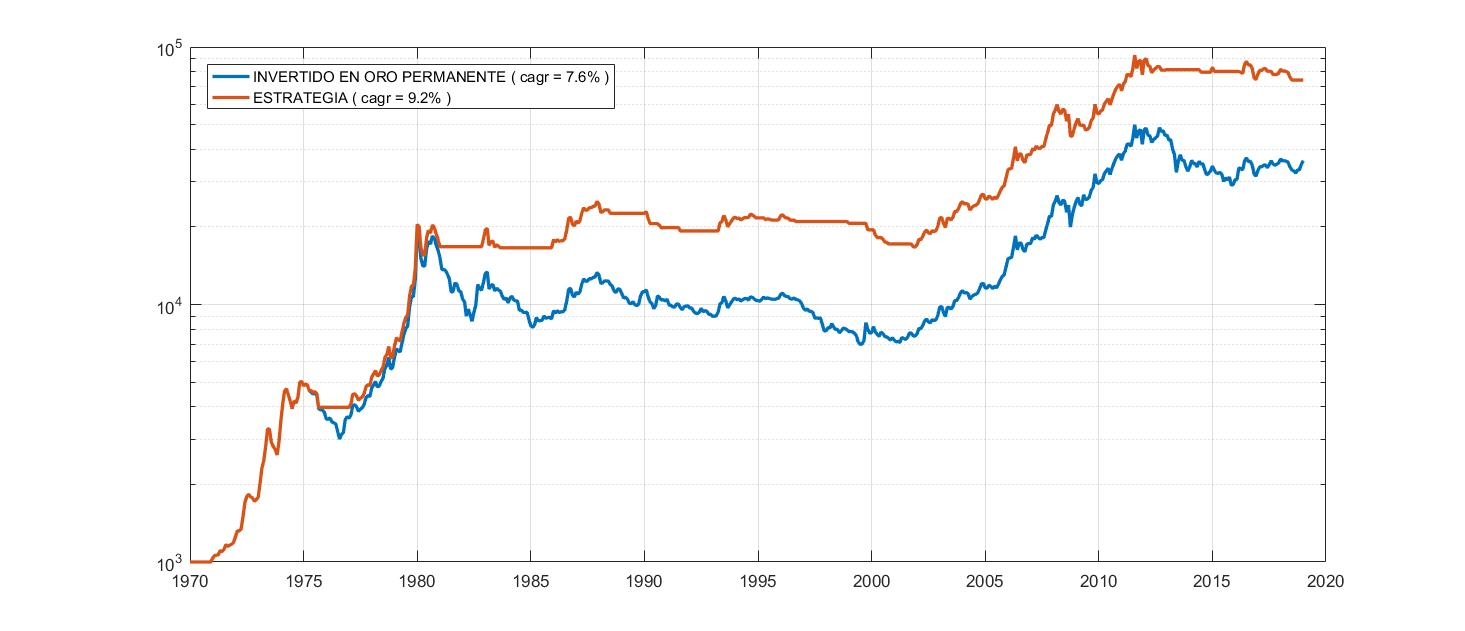 La estrategia es muy sencilla, más no lo puede ser. Simplemente se aprovecha de la inercia a largo plazo que tiene el oro. Simplemente consiste en, cada primero de mes vemos si el retorno a un año del oro es positivo; en ese caso mantenemos el oro en cartera, si no es así nos deshacemos del oro hasta el próximo mes en el que volveremos a hacer esta comprobación. Es un criterio muy sencillo, como todos los que funcionan a muy largo plazo; nos ofrece un plus de rentabilidad y nos disminuye las pérdidas en tendencias bajistas. En la siguiente gráfica podemos comparar una inversión en oro permanente frente a lo que obtenemos con este criterio.