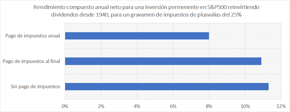Primero vamos a calcular el rendimiento que tendríamos sin pagar impuestos, invirtiendo en el S&P500 reinvirtiendo dividendos, desde 1940, sin vender nada hasta el día de hoy. Lo que obtenemos es un rendimiento anual compuesto del 11.3%.